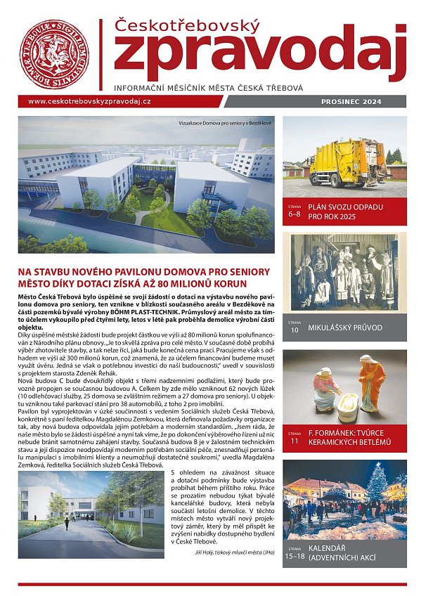 Prosincové noviny vám přináší informaci o získání dotace na stavbu nového pavilonu Domova pro seniory v Bezděkově, výzvu k nominaci na Ceny města KOHOUT a Českotřebovské Ámos a nechybí nové plány svozu odpadu pro rok 2025